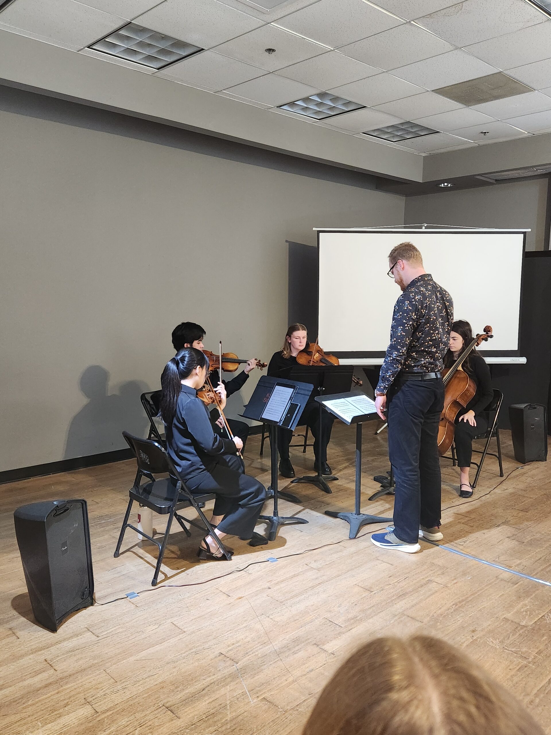 On behalf of the Student Composers Association at IU, Jacobs School of Music student composer Thejas Mirle organized the musical performance based on these creative works, and the composers led an ensemble in playing the compositions. Composers were: Elijah Culp; Steven Naylor; Zhu Rui; and Timothy Reinholz; Instrumentalists were: Violin I: Yue Ning; Violin II: Jose Eserjose; Viola: Sinead Whelan; Cello: Johanna Di Norcia.