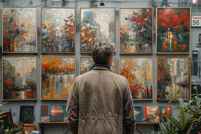 man looking at art